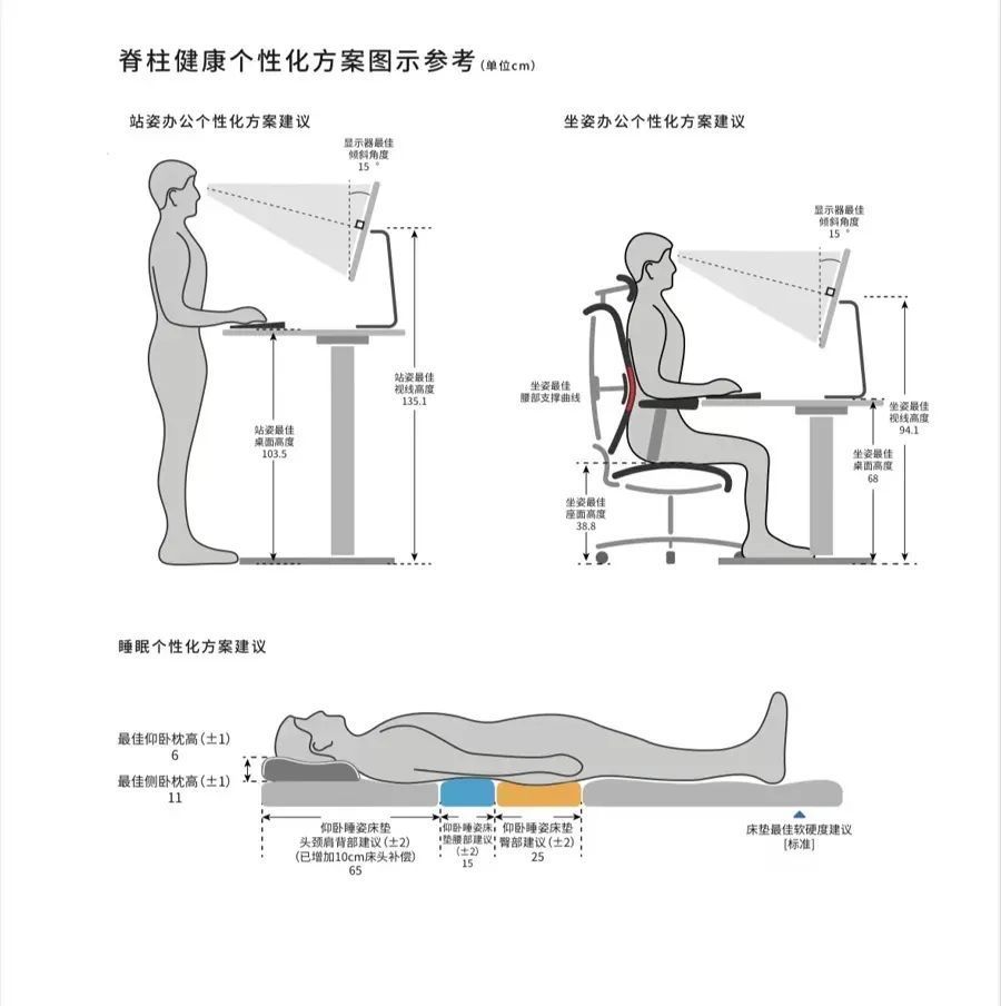 报告显示,对小陈来说,站立办公桌面最佳高度是110厘米,坐着办公桌面最佳高度是71.5厘米,椅子最佳高度是40.8厘米,睡觉床垫则建议“标准偏硬”。同时,还为其提供了最佳仰卧枕高、侧卧枕高等一系列数据。