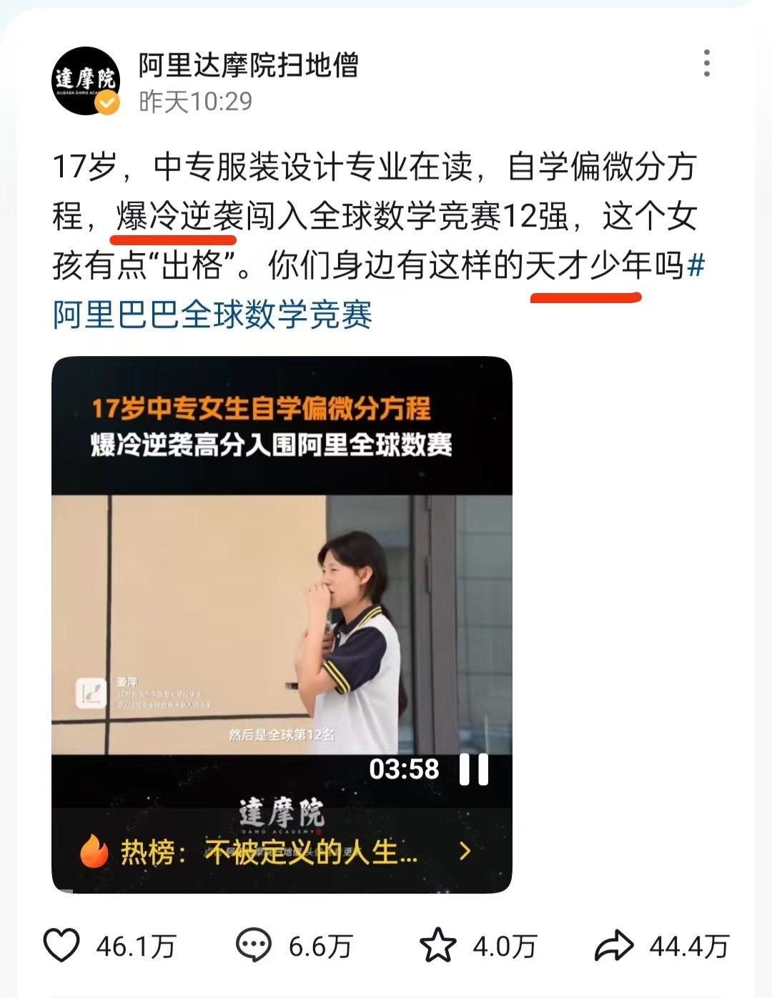 阿里达摩院就用了“爆冷、逆袭、天才少年”等词形容这位17岁的选手的表现。坦白地说,姜萍承受得起这样的夸奖。