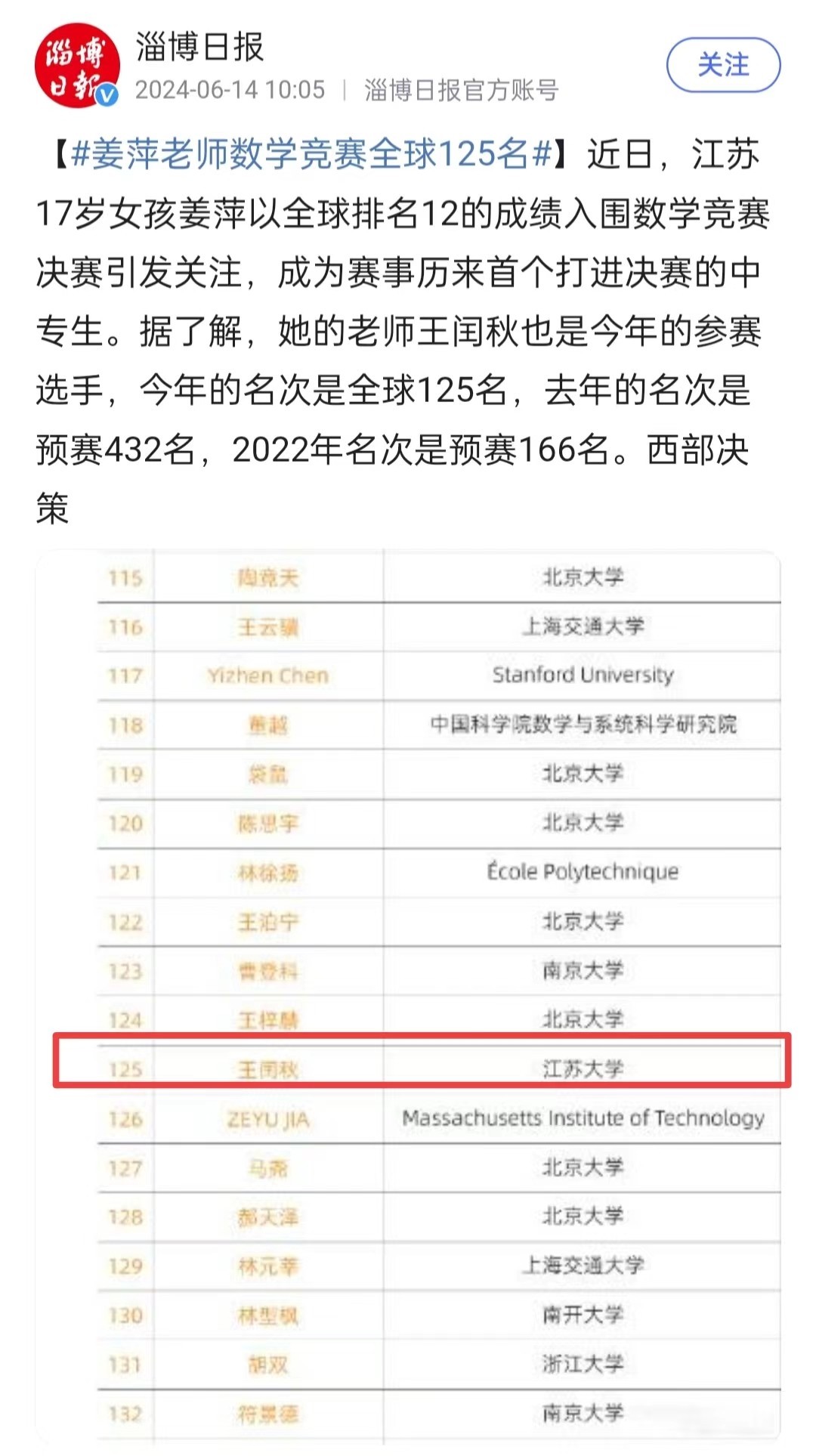 姜萍的数学老师王闰秋,也参加了今年的阿里数赛,其名次是全球125名,去年的名次是预赛432名,2022年的预赛名次是166名。