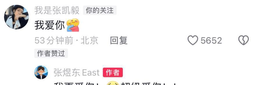 张煜东在网上向张凯毅深情表白:“我更爱你,超级爱你!”他们之间的爱情不是空口说白话,而是处处可见。像他们在张凯毅的家乡赤峰市结婚这个小事,其实就是深深的爱意展现,也是尊重并接受对方的一种方式。这种真挚而美好的爱情,真的很让人感动和羡慕。