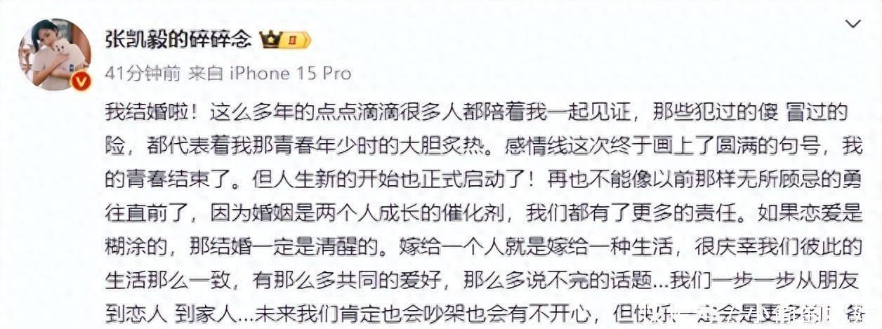 留言那头的张凯毅只说了五个字"我结婚啦",就能看出她多么激动!她回忆起以前的日子,傻事、冒险啥都有,正是那个年纪的热诚与勇往直前的精神。她这样子的女孩子真的很吸引人!她的人生经历,告诉我们每一个人,要敢于追寻自己的幸福。
