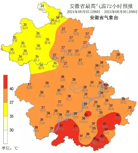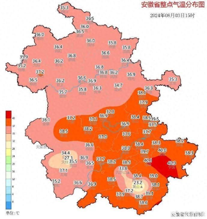 安徽气象显示,截至15时,全省基本无降水,全省大部分地区最高气温36-38℃,江南部分地区达到或者超过40℃。