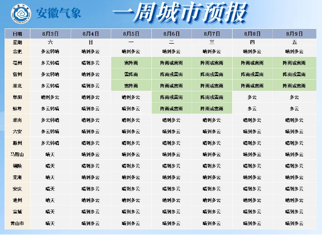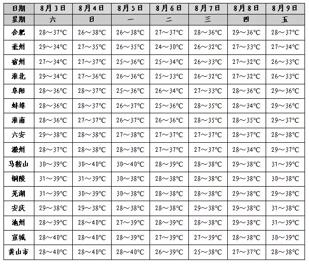 未来一周安徽省沿淮淮河以南有持续性高温天气,大部分地区最高气温37~39℃,局部达到40℃;淮北地区3-5日最高气温可达35℃左右,6日后最高气温普遍在35℃以下。
