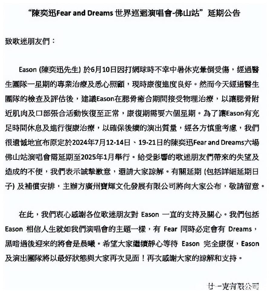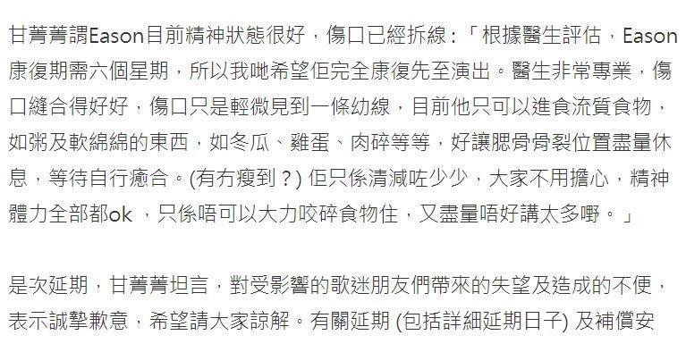陈奕迅受伤骨裂仍未出院,只能吃流质食物,将暂停两个月演出
