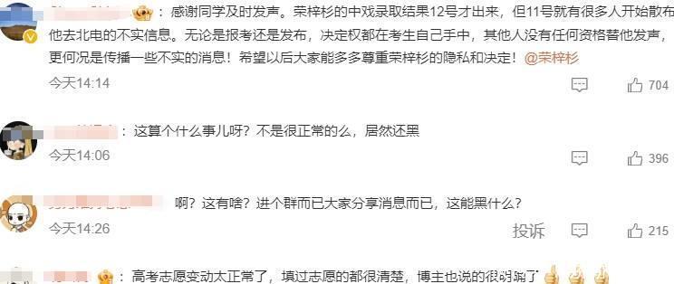 不过荣梓杉提前加入北电新生群又没选择北电的做法,让北电的同学很伤心。甚至有人觉得荣梓杉出尔反尔,没有契约精神。