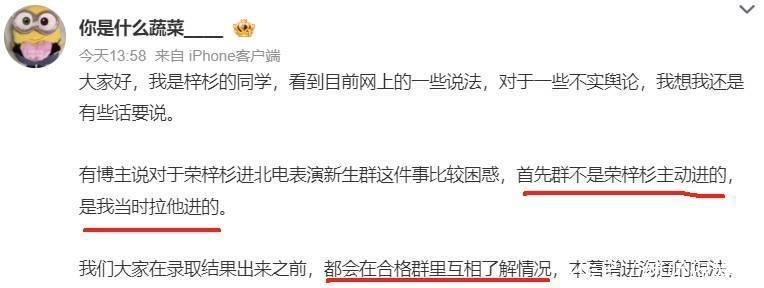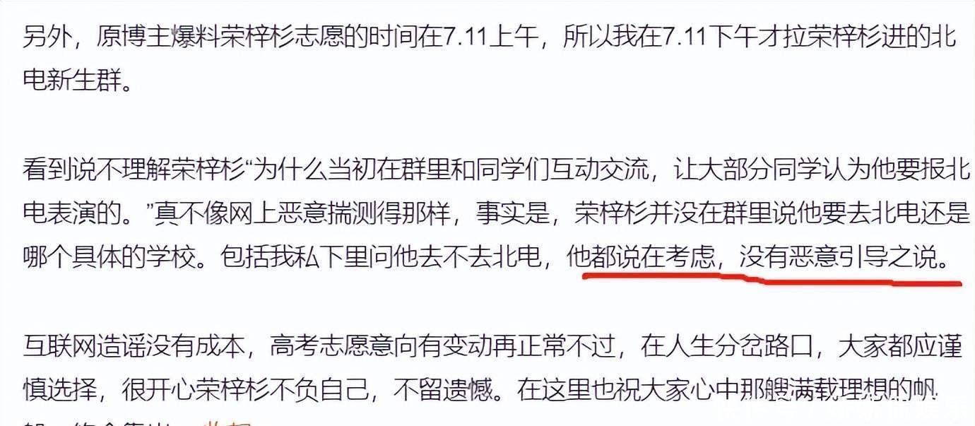 随后一位自称是荣梓杉同学的网友发小作文表明,被中戏录取前荣梓杉本人也没确定到底上哪所学校,还处于观望状态。同学希望让他对北电多些了解,便把他拉入新生群,他本人也是被动进群的,从来没说过想去北电。