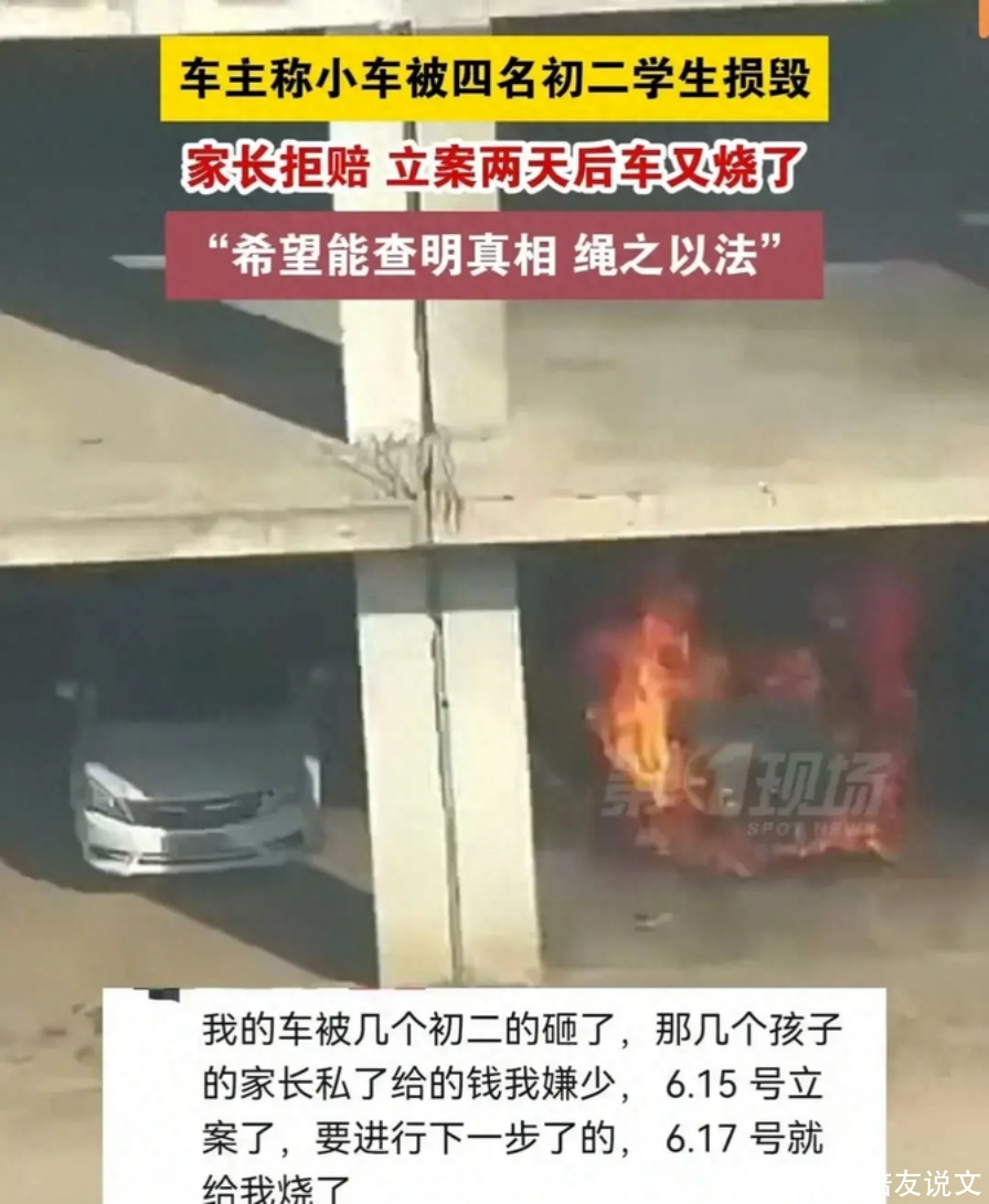 谁干的?河北4名初中生砸车后,家长拒赔,立案后,车居然被烧了