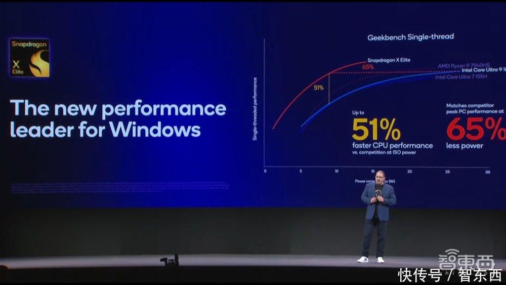 在CPU方面,高通自研的Oryon CPU,单线程性能领先竞品51%,同峰值性能功耗低65%,可以说在能效比表现上十分亮眼。这也是骁龙X Elite笔记本电脑产品可以实现多天续航的关键。
