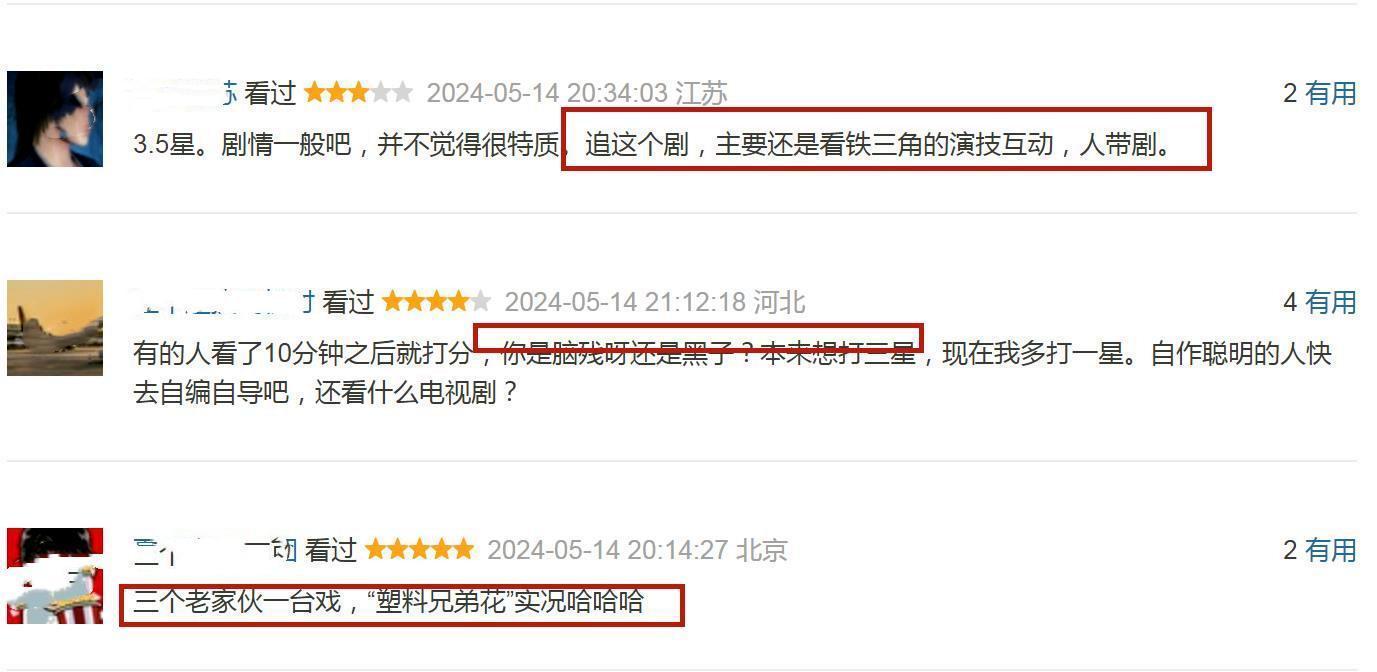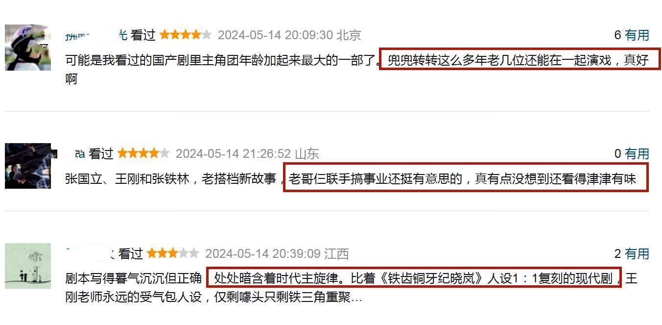 不管是张国立、张铁林,还是王刚,三位老演员们的演技都没得说。三位老戏骨们绝佳的松弛感,让这部缺乏高质量戏剧冲突的剧情,有了新看点。