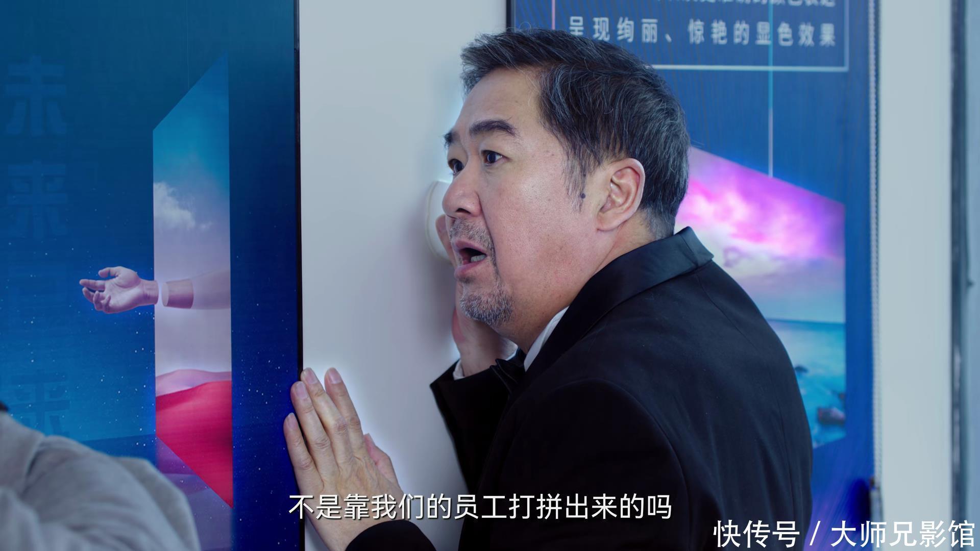张铁林扮演的陈新城在跟董事会发火,肖国庆和孙前程在屋里偷听。画面中,王刚半张着嘴,趴在门上。而张国立则紧贴着门,边听,边说话,连带着眼神还滴溜溜传。