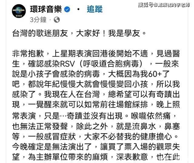 观天下:歌神张学友台北演唱会因RSV感染取消,粉丝忧心期盼早日康复