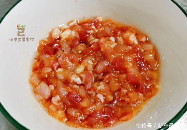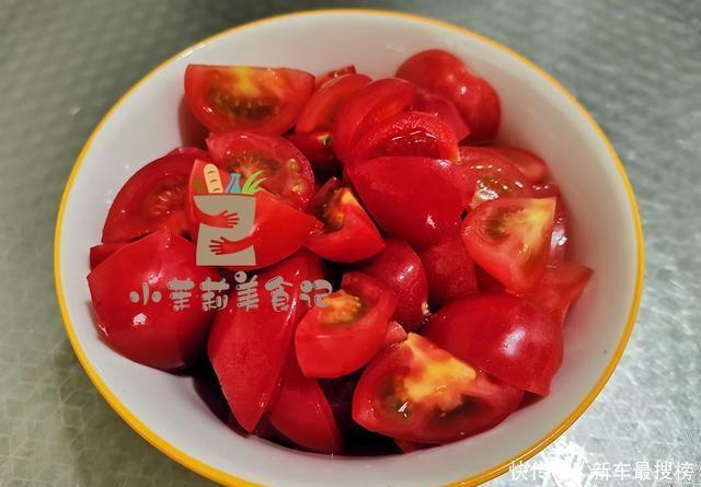 2、准备一把小番茄,逐一去掉果蒂,并搓洗干净,之后分别切小丁,装碗待用。小番茄滋味浓郁,汁水也更多,炒菜更鲜美。