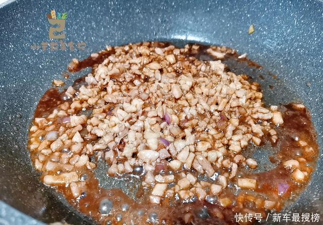 2、准备一些鲜肉,切成小丁,可以搭配少量的肥肉,炒菜更香,放生抽,盐,淀粉搅匀,再喷一点玉米油封住水分。