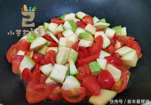 4、将小番茄倒进去底油中进行翻炒,一分钟左右汁水析出,将西葫芦块倒进去,加一点蒜蓉,快炒均匀,焖三分钟左右,将其彻底焖熟。