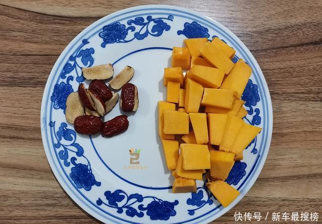 1、准备一块200克左右的南瓜,清理干净之后切小块。另外再来两三个枣,洗净后剔出核。