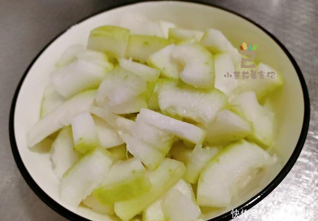 1、半个青皮冬瓜先冲掉灰尘,接着将外皮削掉,掏出瓤和硬籽,再冲一遍,切成厚片状。