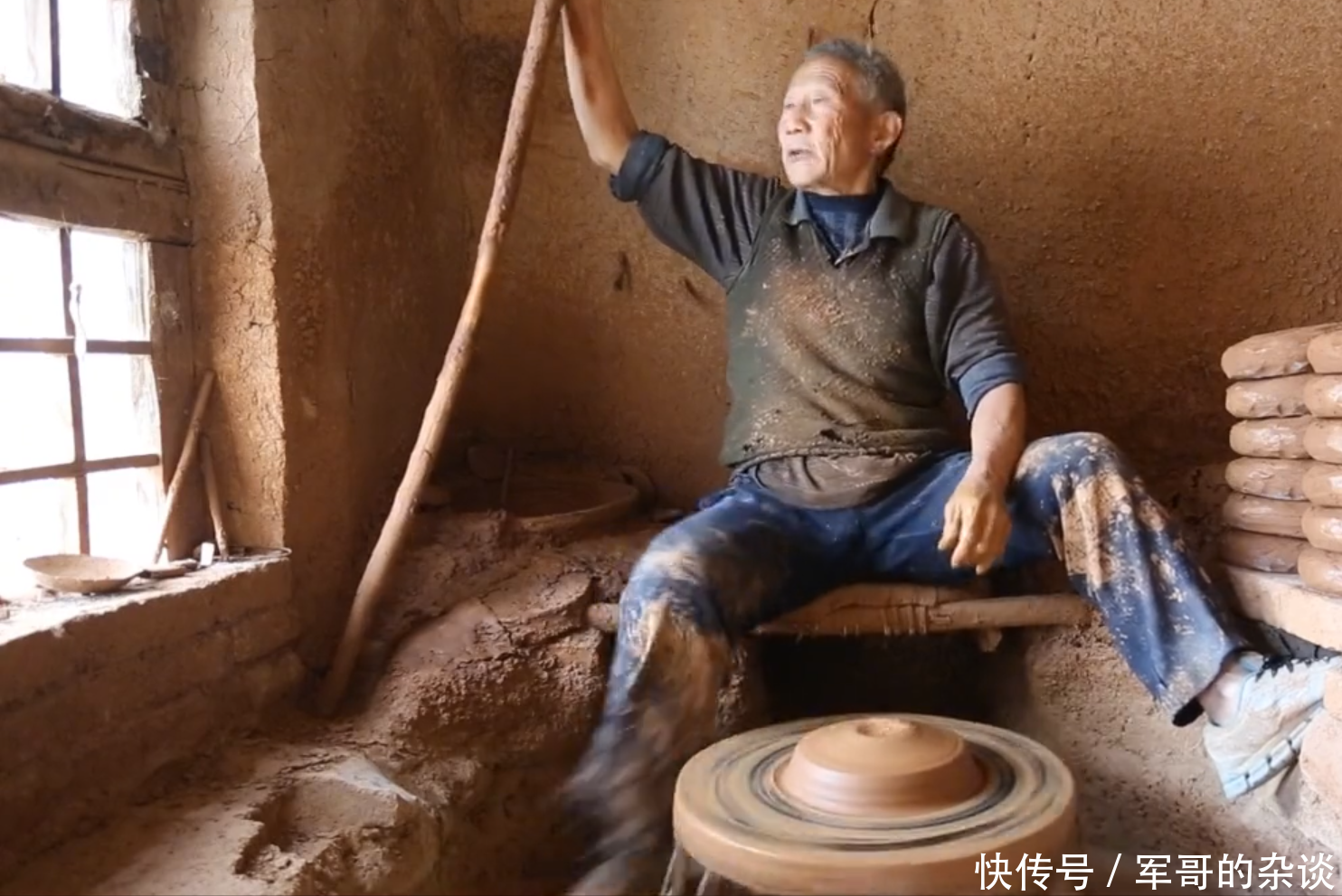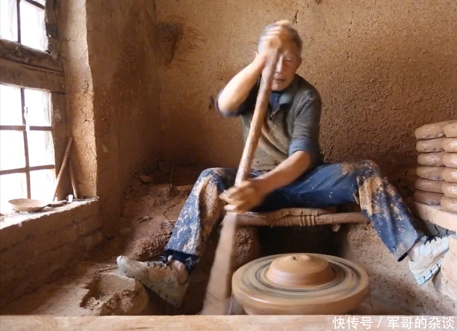 等到速度差不多了,将泥胚放上去,撒上点水,然后再用脚转上几下,便会抄起一旁的长棍子,伸到大轮子里面快速搅动。
