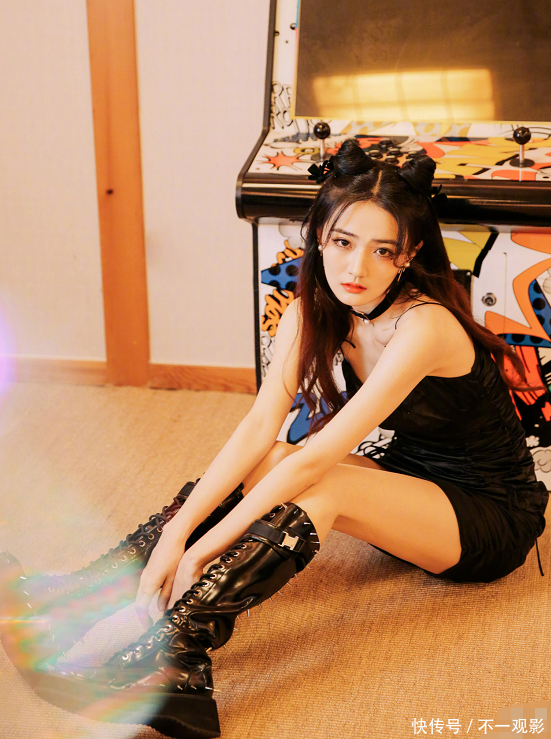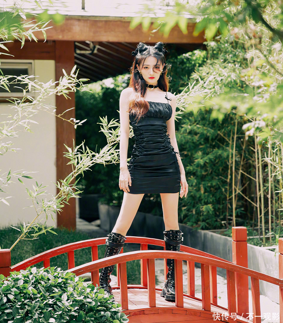 只见她穿上吊带小黑裙,下面搭配了一双铆钉款的长靴。