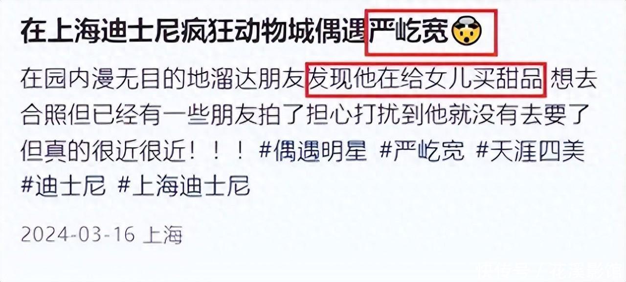 有位网友曾经在上海迪士尼疯狂动物城巧遇严宽,严宽正为女儿购买甜品,接着就是很多网友求照。网友们怕扰到严宽便不上前拍照。