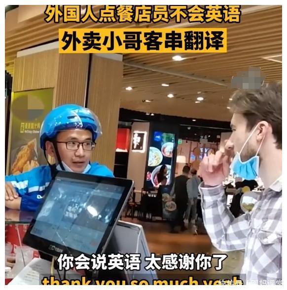 此前在上海的一家餐饮店,一位外国顾客,进店点餐,因为不熟悉中文和店长沟通不畅,此时一位取餐的外卖小哥出现了,在一旁做起了两人的翻译,英语口语十分遛。